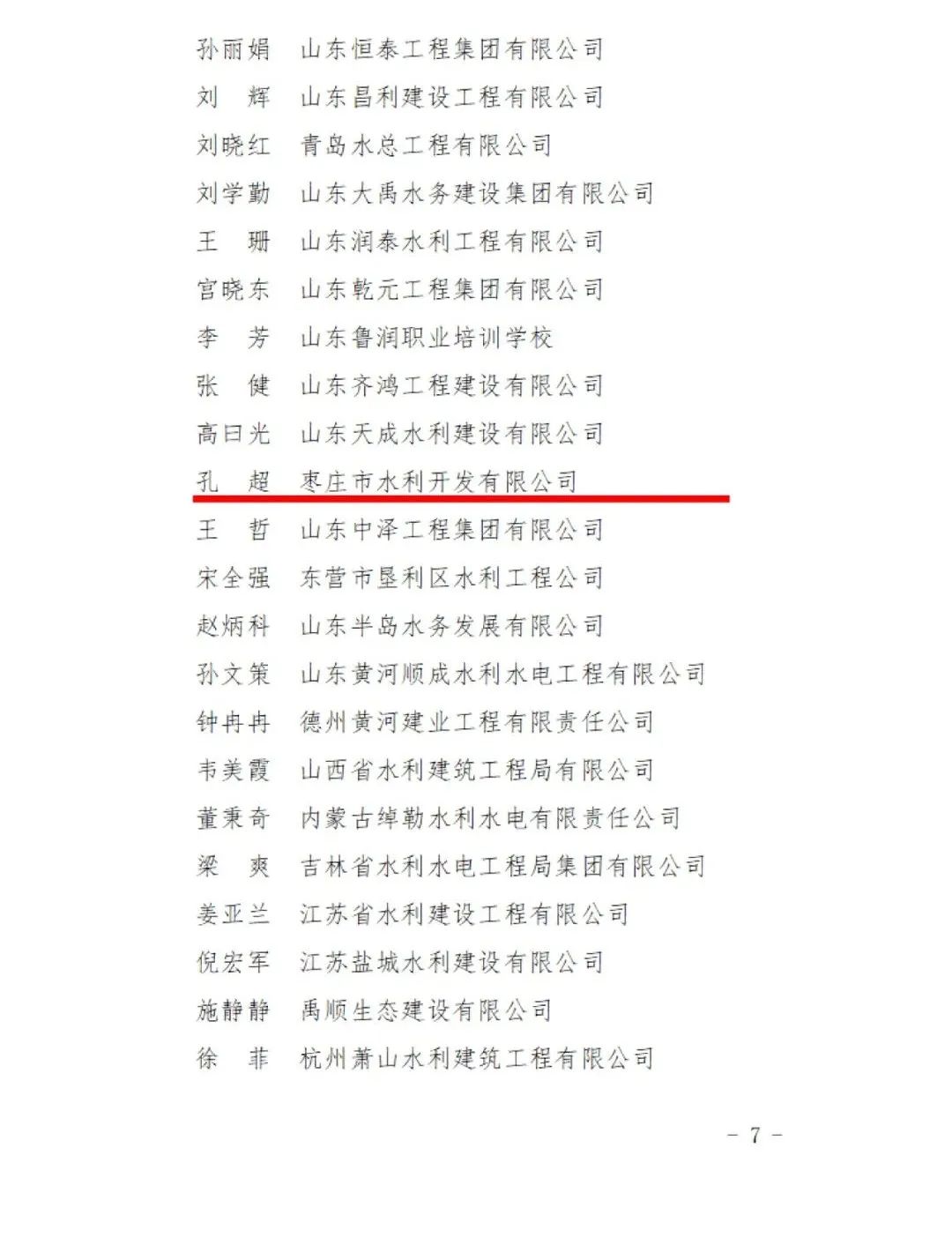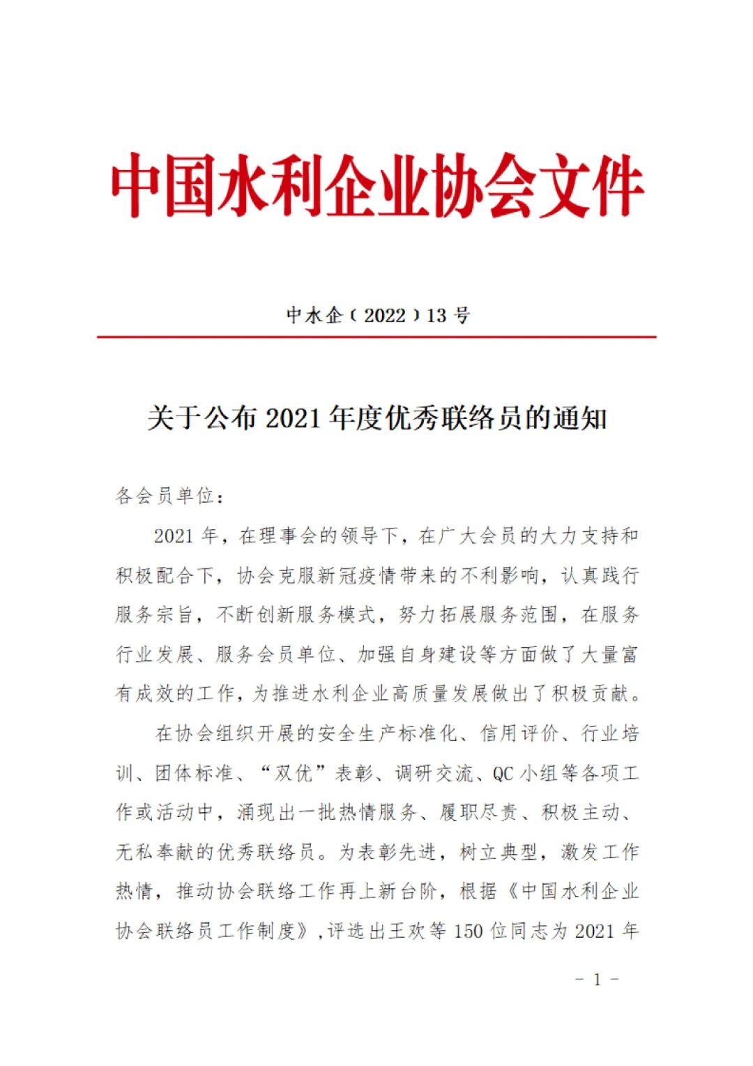 近日,中國(guó)水利企業(yè)協(xié)會(huì)公布了2021年度全國(guó)優(yōu)秀聯(lián)絡(luò)員名單,棗莊市水利開(kāi)發(fā)有限公司的孔超同志榮獲全國(guó)優(yōu)秀聯(lián)絡(luò)員稱號(hào)。